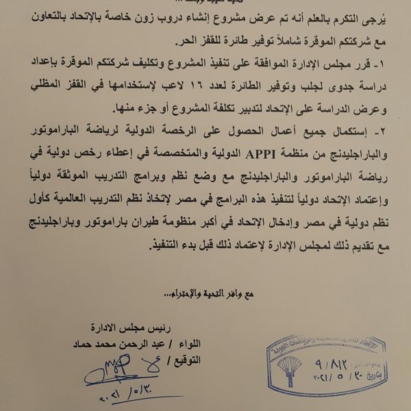 Its main goals towards the Egyptian Federation are determined based on the conditions of air sports in Egypt to help and develop, as follows: